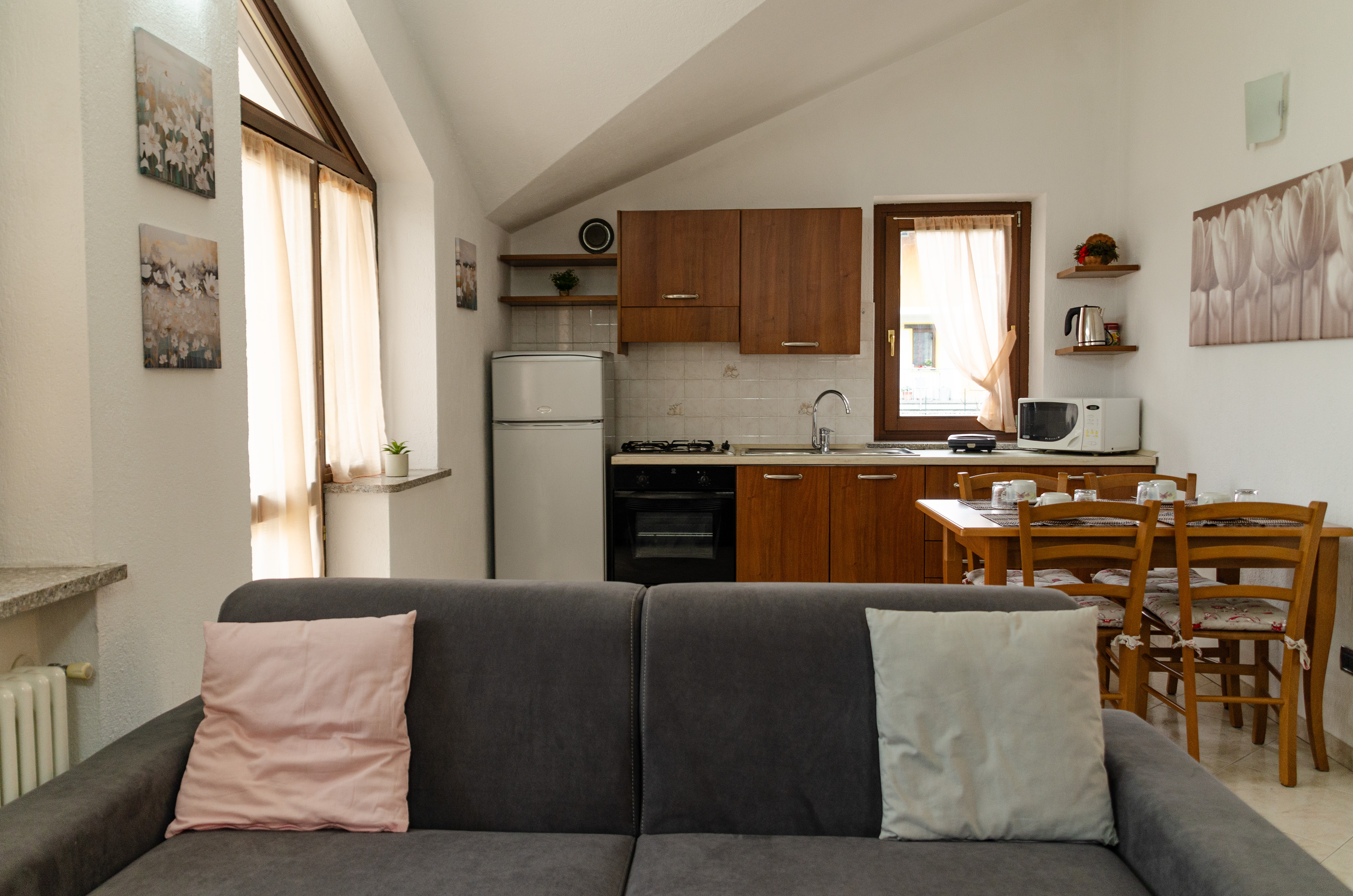 La zona giorno, molto accogliente e luminosa è corredata da una TV HD da 30” e wi-fi ad alta velocità.
