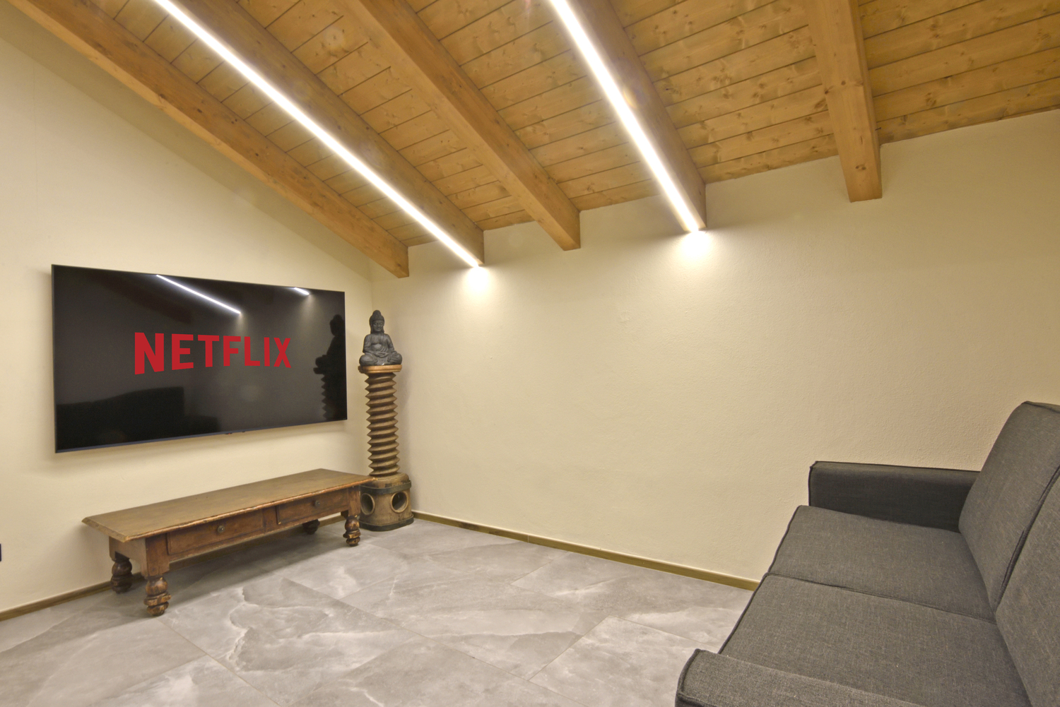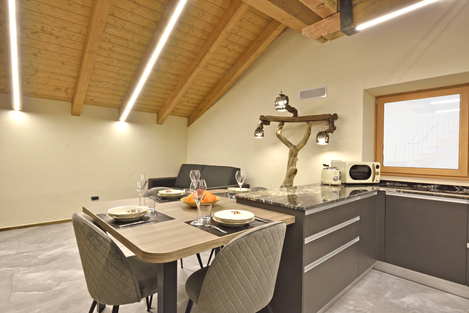 La zona giorno, luminosa e accogliente, è attrezzata con Smart TV (Netflix, YouTube, ecc.), connessione Wi-Fi ad alta velocità e un confortevole divano letto matrimoniale, perfetto per il relax.