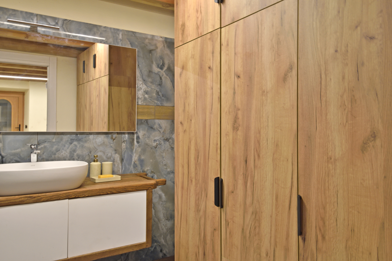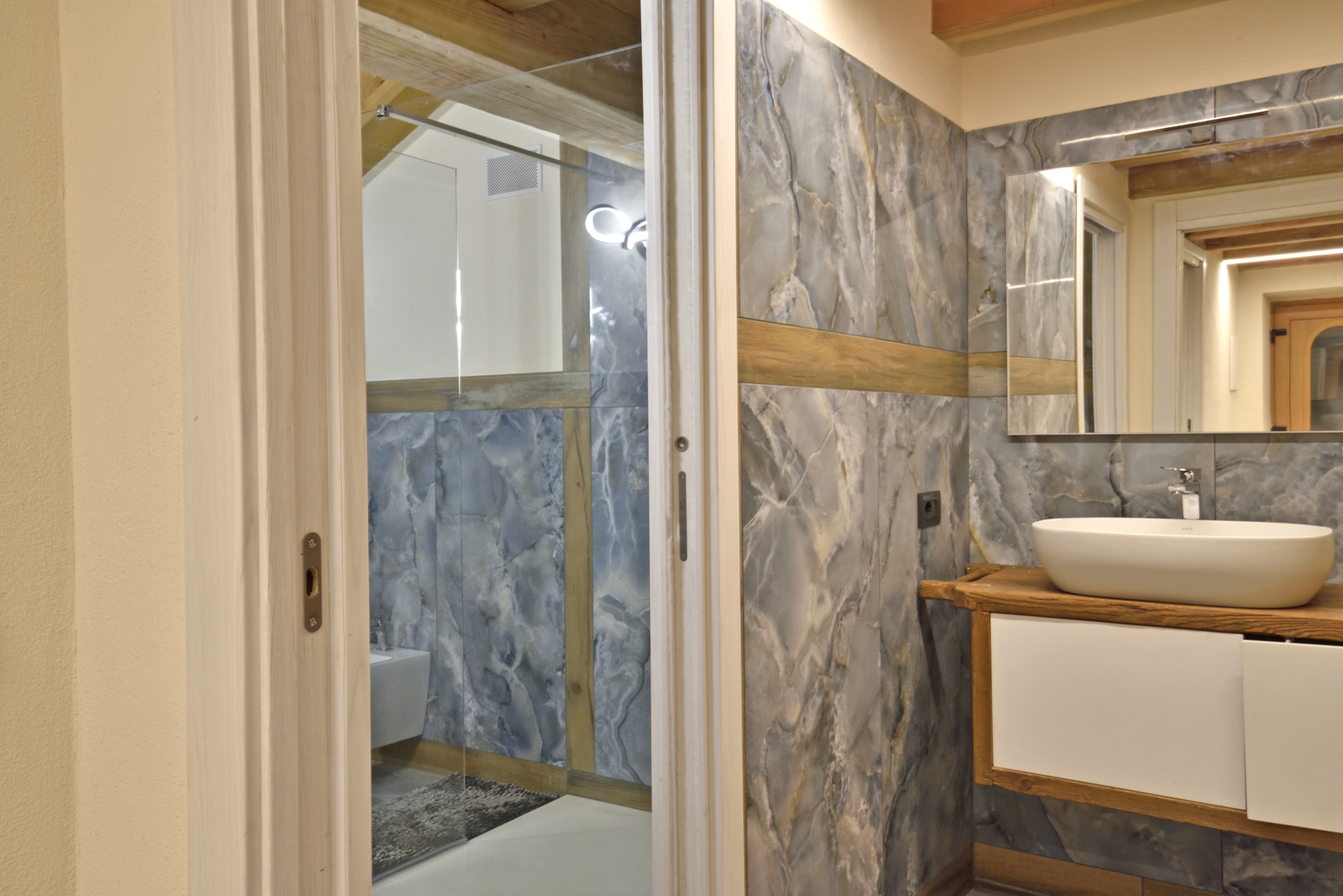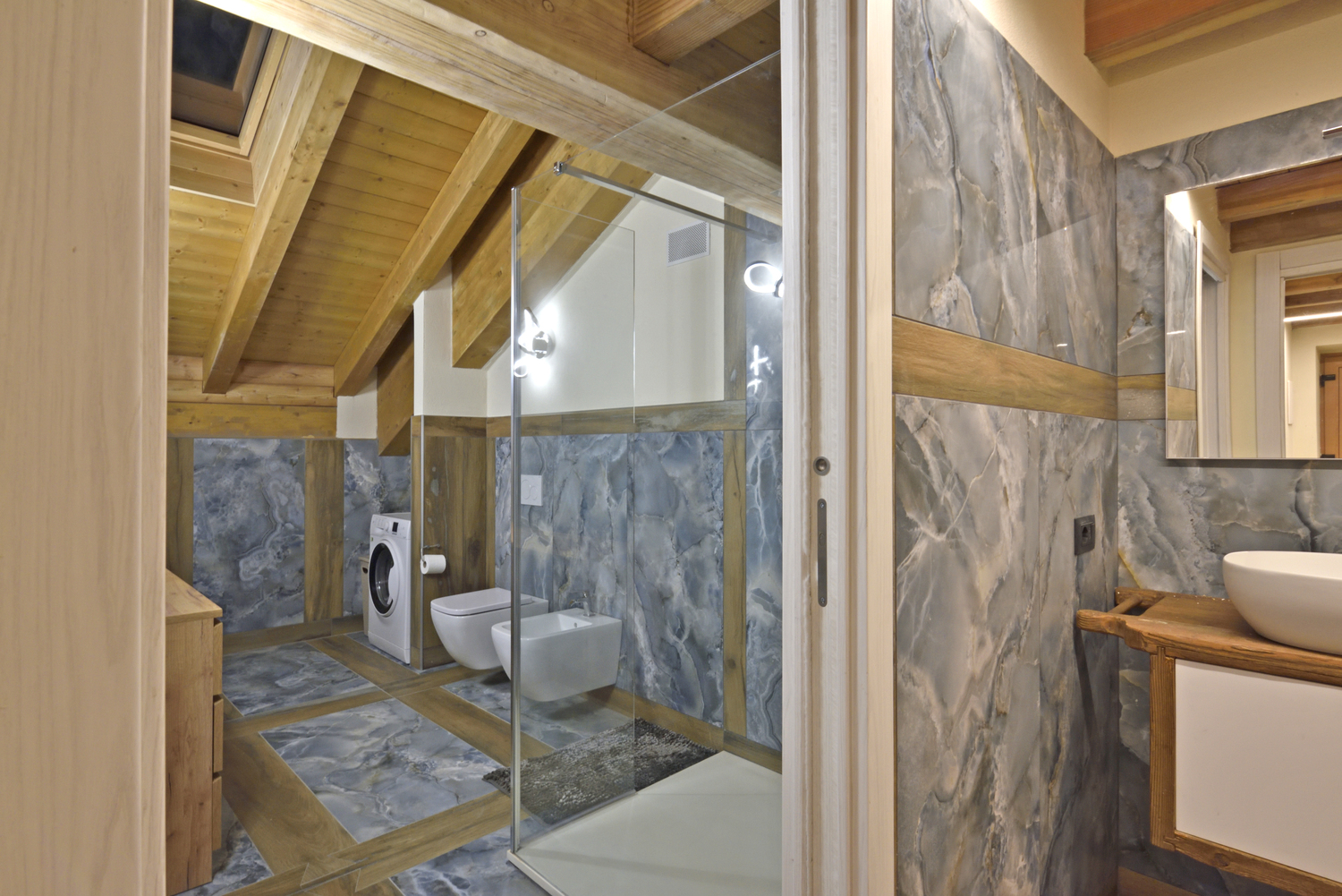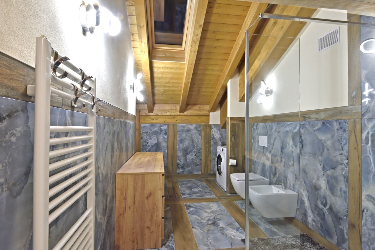 Il bagno, moderno e spazioso, è dotato di ampia cabina doccia, sanitari completi, asciugacapelli, grande specchio, shampoo e bagnodoccia. Sono presenti scomparti e vani su misura per riporre comodamente effetti personali e valigie.